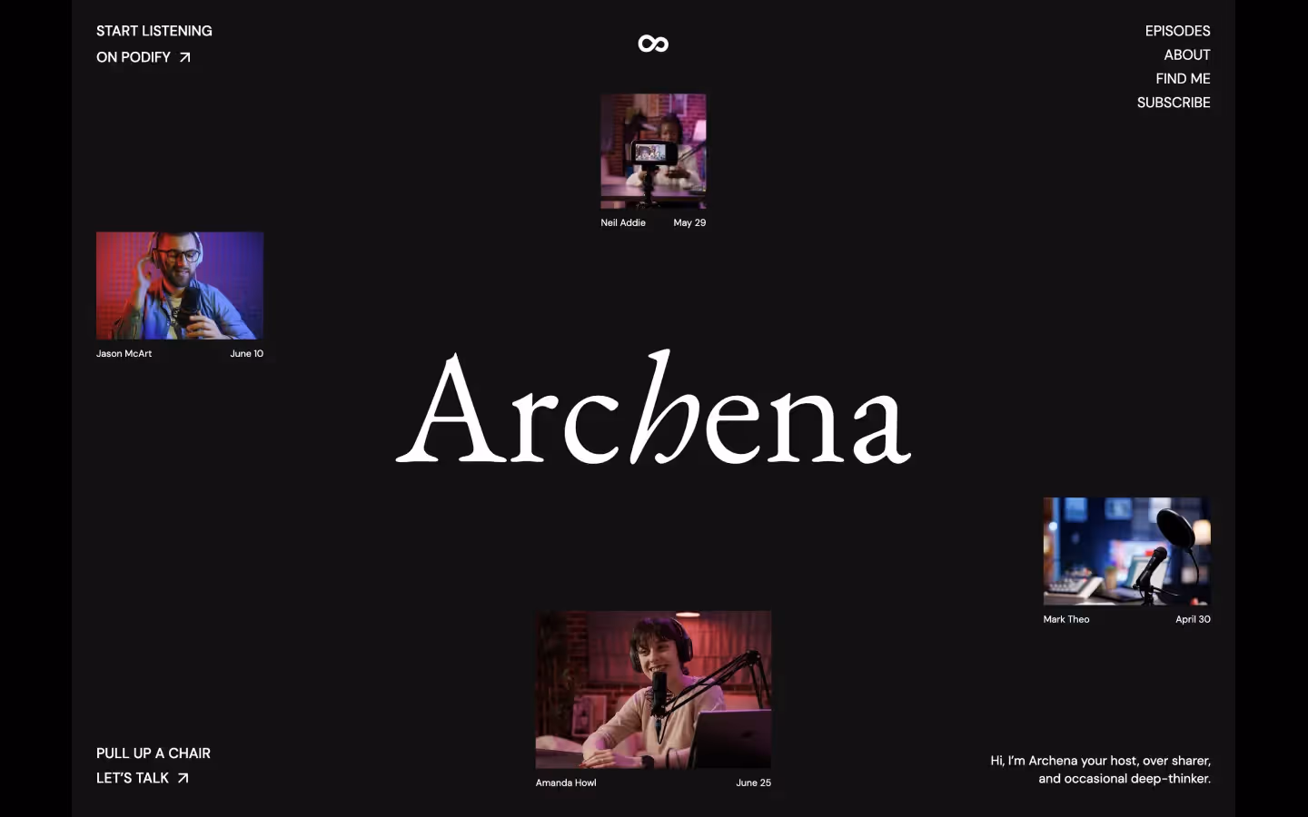 Built with podcasters in mind, Archena makes it effortless to connect with listeners, grow your community, and showcase your voice in a way that feels authentic and engaging.