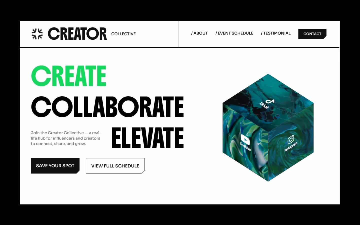 Creator Collective is a versatile Webflow template crafted for conferences, creative gatherings, and professional events. Designed with a clean, modern aesthetic, it’s perfect for showcasing your event’s unique vibe while providing visitors with all the essential details.