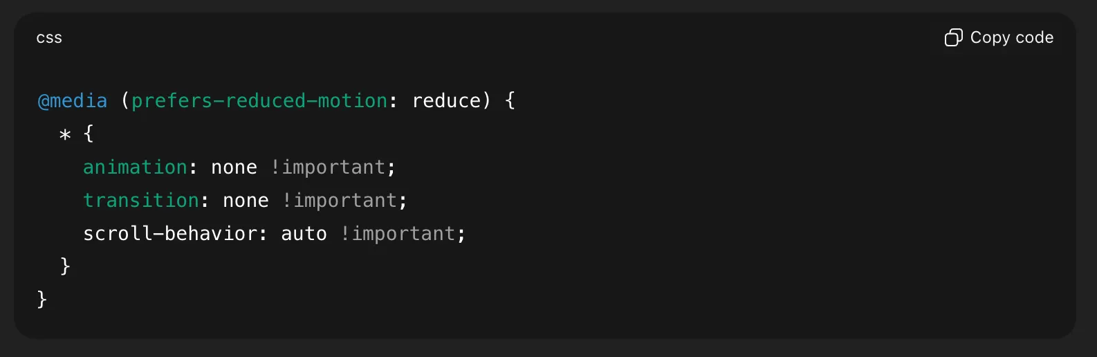 prefers-reduced-motion Media QueryMost modern browsers and operating systems now include a user setting called “Reduce Motion.” Designers can detect this using a CSS media query: